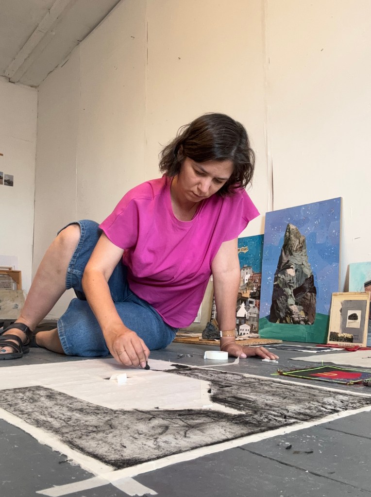 Nat Loftus lives and works in North Tyneside. A self-taught painter and collage artist, she uses a range of mediums and materials to tell stories of human transience, playing on the borders where joy and grief meet.