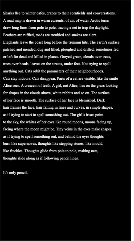 In this neighbourhood there wasn’t room for anything too grand; I’d never cut deep a canyon or laid as a lake bed, as in other places. I’d lately landed as a balled-up tissue beside a sorrowful sniffler, half-drowned myself as a soap bubble in a window-cleaner’s bucket, slotted into a stack of empty plates on a kitchen sideboard, and laid as more chewing gum to be stepped on. The larger houses in the neighbourhood, the ones with drives and decorative statues, had generally acquired more of me than the smaller homes, as I mixed my little selves into gravel or nestled them amongst the curls of a sitting lion’s stony mane. And I watched. Peering from behind straggling clouds to see if anyone would take one up in their arms, these pieces of me. This is a story about someone who did. There have been many of course, and I could tell you about them, but this was a girl who almost matched me in my loneliness, and it was not so long ago.