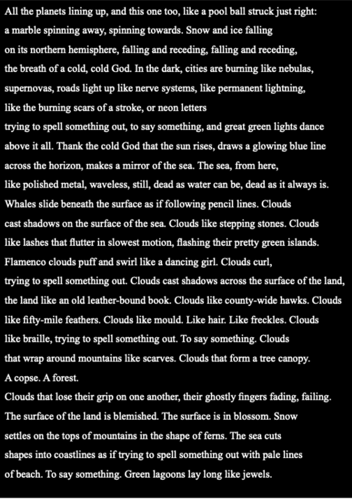 A family, her feet were pondering, shouldn’t be like a solar system either. Why should everything revolve around one sun? A sun can die just like anything else, Joan’s brain offered. That’s how you get supernovas. Black holes. Joan remembered this stuff from school. The unlit, top half of her face contracted into a frown. They always teach optimism at school don’t they, so that kids leave with the impression that the world’ll keep getting better. Do they think kids won’t notice the black holes everywhere?