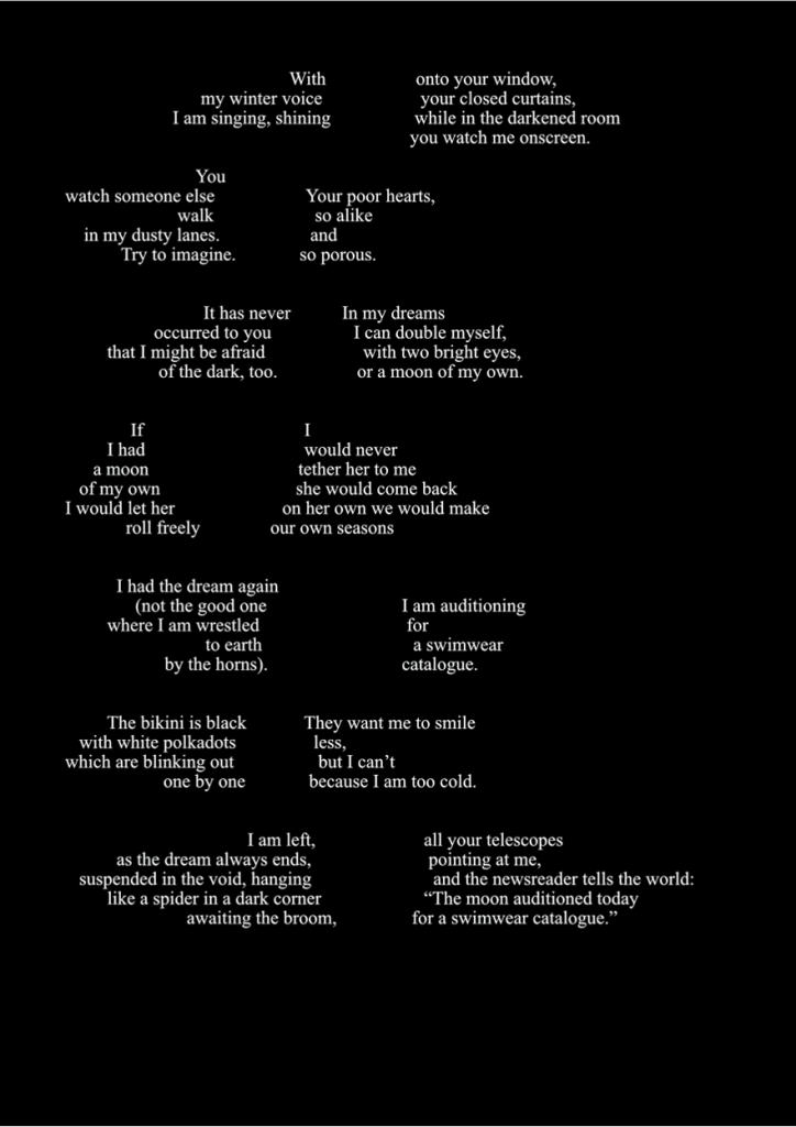 What matters is that you don’t look up as often as you should. It was the same in this neighbourhood as everywhere else. You’d have missed all kinds of things;the well-fed bats politely applauding a particularly pleasant evening’s end, the exact same cloud that visited the Green on the same April day each year,and of course all the gifts that I sent down daily and nightly. I am nothing if not generous, gently dropping my gifts upon you all throughout the centuries. I give myself up so often. It’s difficult for you of course, with such sweet little onion eyes, to distinguish during a storm which of the hailstones are really hailstones and which are little melting moons, but if you could just stop blinking so much you might notice a crescent floating down on a mild afternoon, barbed on a feather, or realise that you aren’t stepping on chewing gum this time, but a friendly gibbous laid at your feet.
